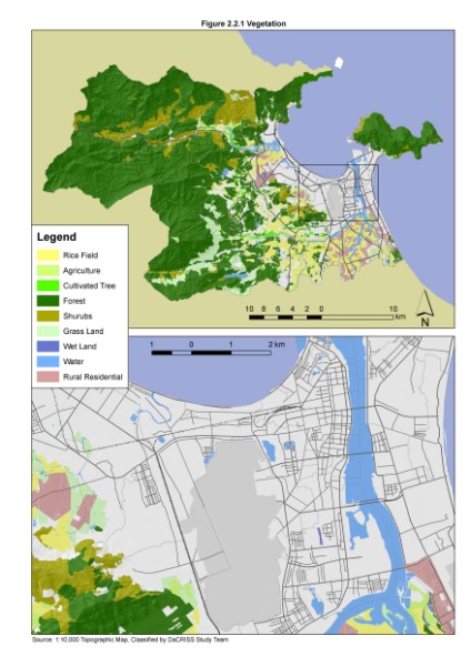 - To understand the existing conditions of the study area and to know the spatial distribution of development constraints and opportunities to support the development of a comprehensive master plan for Danang City, a comprehensive GIS database was developed for "The Study on the Integrated Development Strategy for Danang City and Its Neighboring Areas in the Socialist Republic of Vietnam (DaCRISS)". Based on this, many thematic maps and analyses were produced.