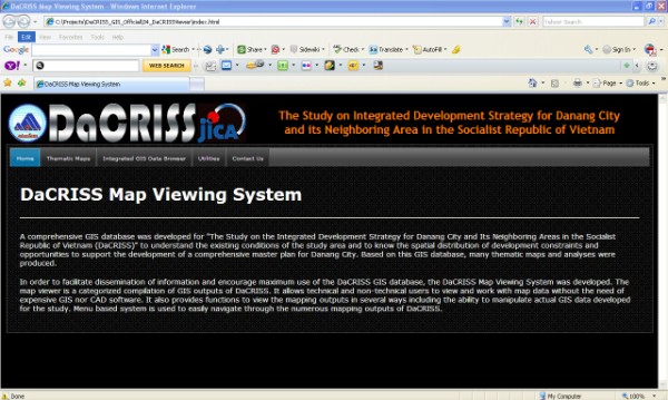 The DaCRISS Map Viewing System, which is a compilation of the GIS outpust of project was developed to facilitate the dissemination of information and encourage maximum use of the DaCRISS GIS database. It also provides functions to view the mapping outputs in several ways including the ability to manipulate actual GIS data developed for the study. Menu based system is used to easily navigate through the numerous mapping outputs of DaCRISS. It also allows technical and non-technical users to view and work with map data without the need of expensive GIS nor CAD software.